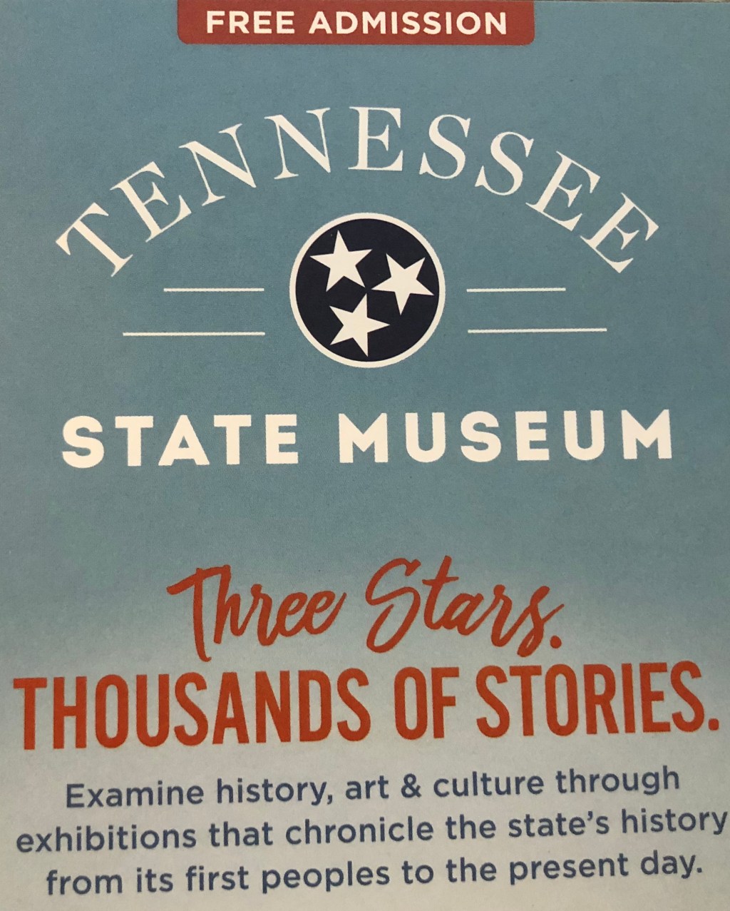 A couple of weeks ago, Adam and I went to the Tennessee State Museum in Nashville. The museum is located just north of the Farmer’s Market, at 1000 Rosa L. Parks Blvd. The facility is relatively new, as they used to be in a different building downtown. Once you park, you can easily visit the Farmer’s Market, Bicentennial Park, and the Museum. If you go on a weekend, get there very early, as parking fills up quickly.