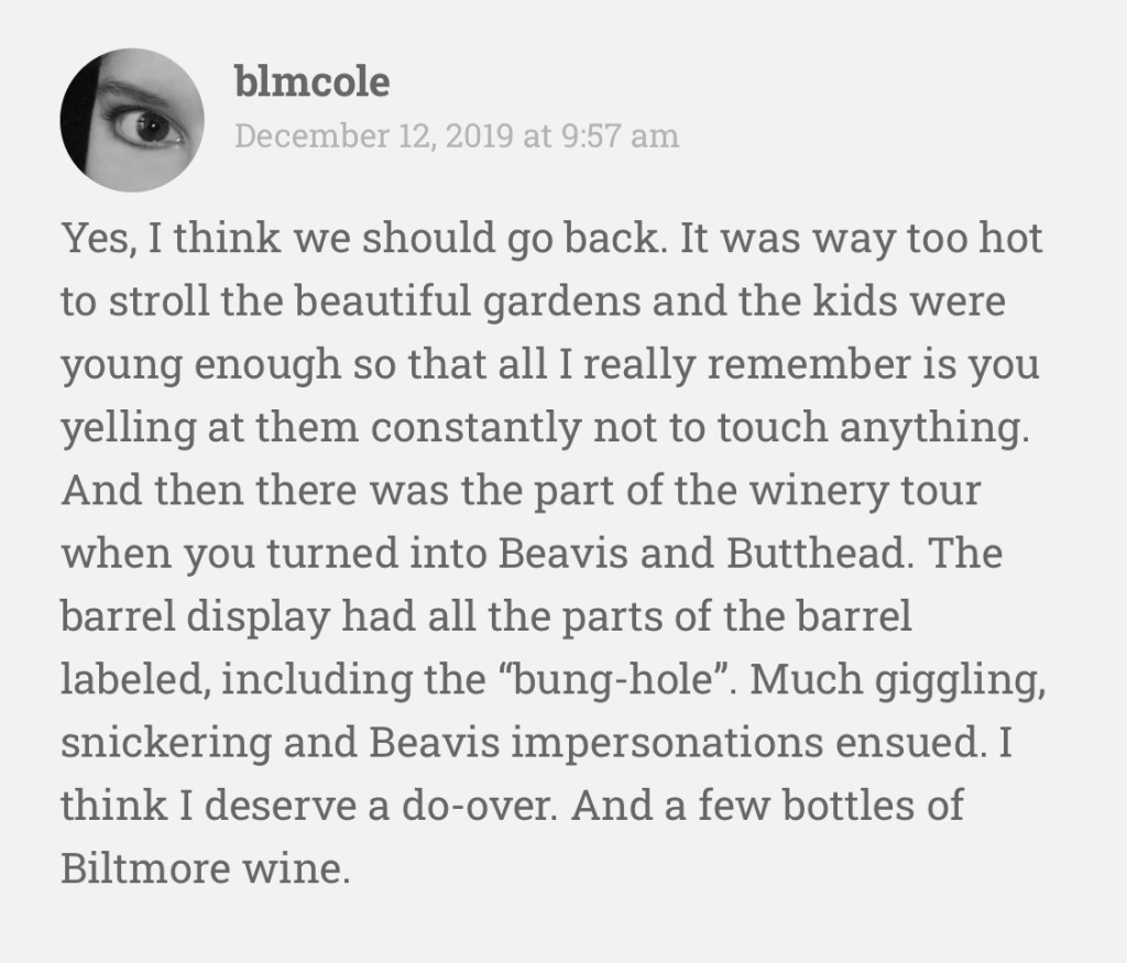 As a special side note, earlier this week we posted about our trip to the Biltmore Estate in Asheville for our #TBT post, found here. My sweet wife remembered the trip well herself, and left the following comment: