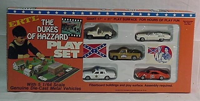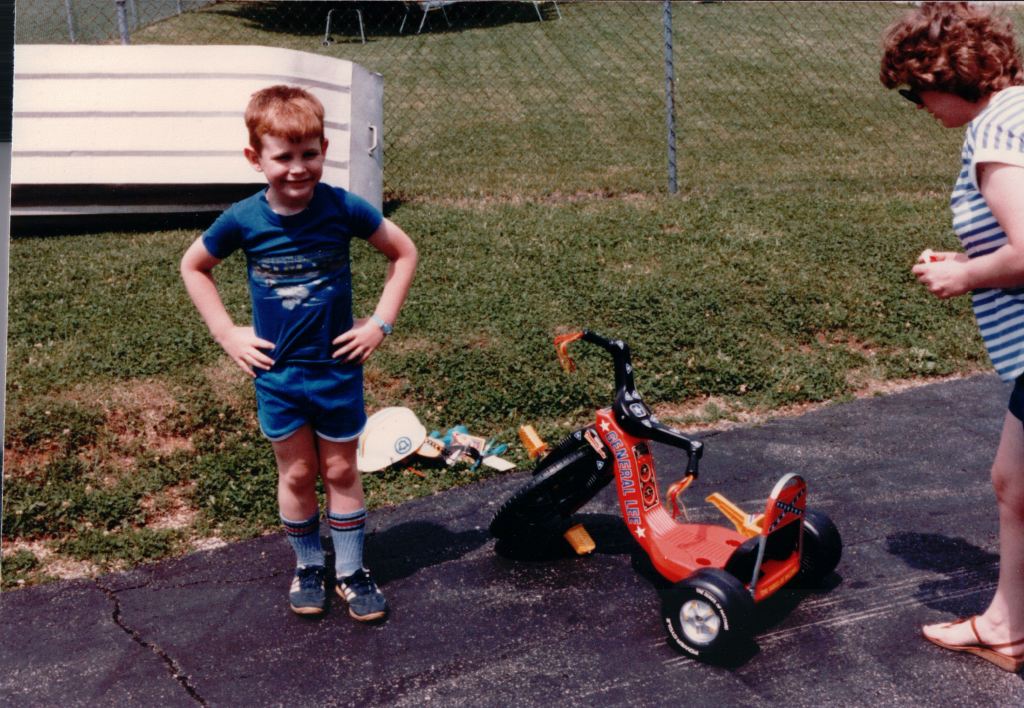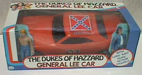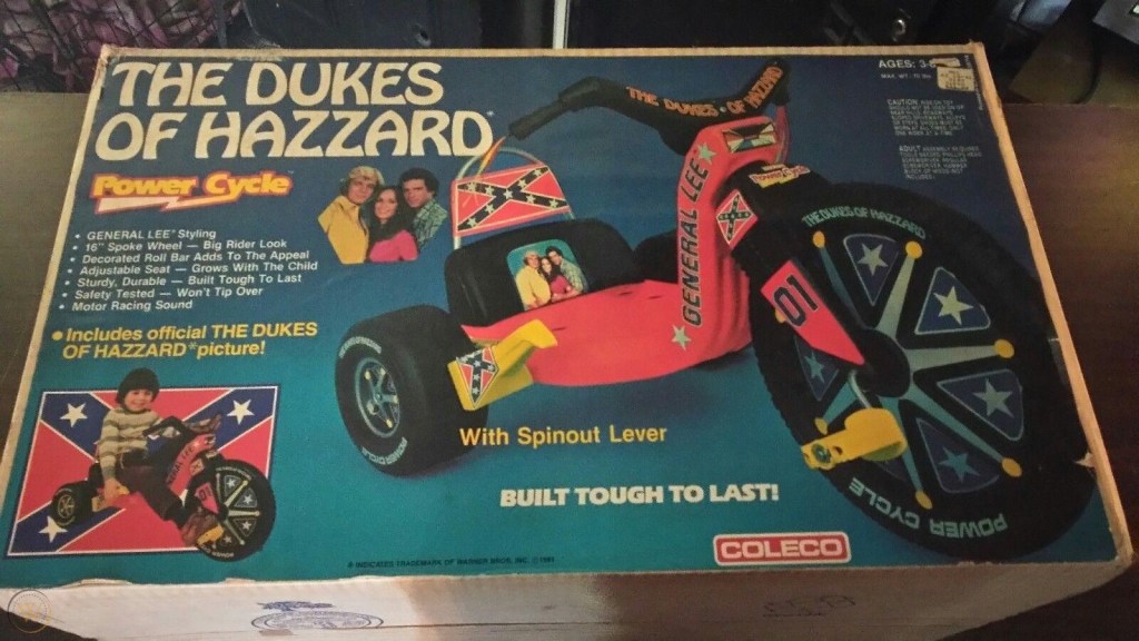 So this really crosses multiple toys, these were my favorites. Sadly, I don’t have these anymore. Ertl made the full line of small diecast cars, and I was gifted a play set that contains the main cars from the series, as well as a play mat with buildings from the town. Hours of fun! Mego made all the action figures, and also a plastic General Lee with a roof hatch that you could put the figures in. In larger scale, Coleco made a ‘Power Cycle’ version of the General Lee. I even have a picture below of me with that the next summer!
