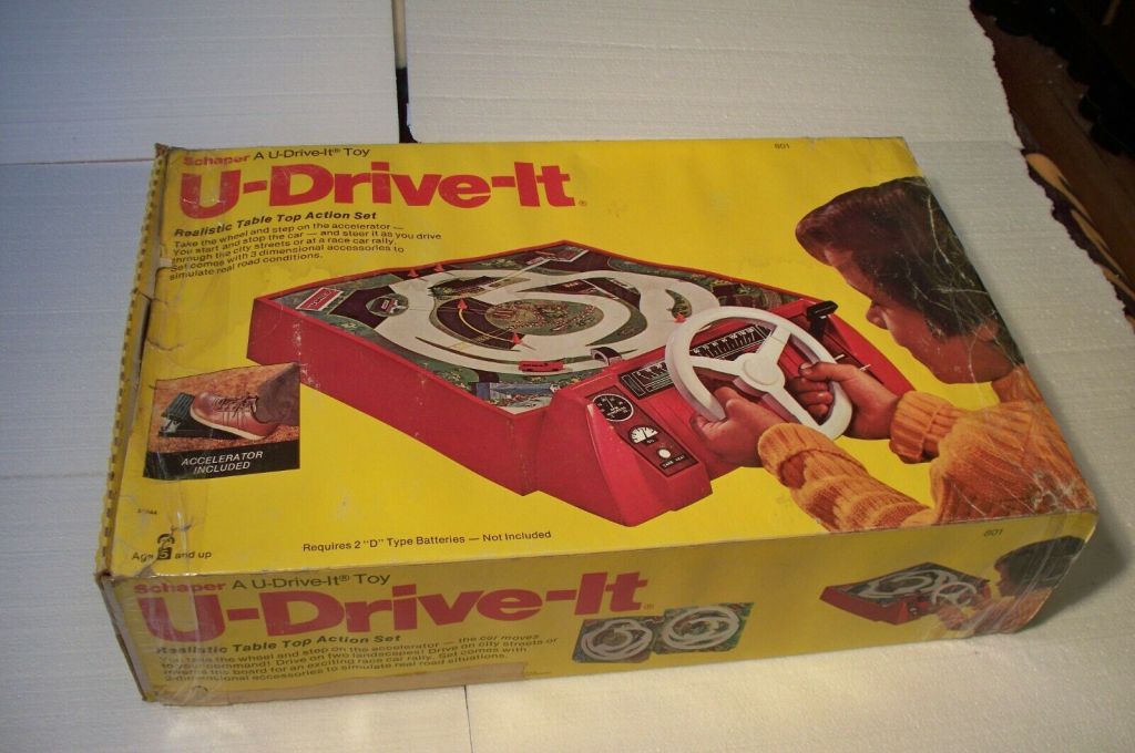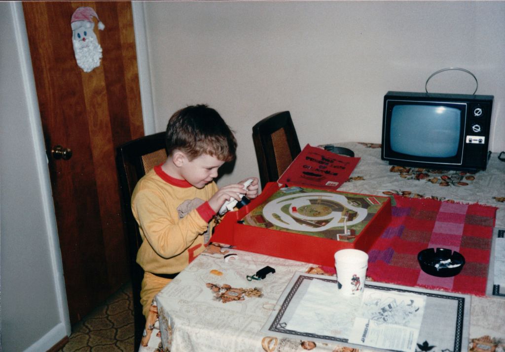 I can’t remember the year I got this, but I sat at this thing for hours if not days. The concept was pretty simple really, it ran on two D batteries, and when you pressed the gas pedal, a lever spun in a circular motion to show your car driving in the road. As you would turn the wheel, the lever would extend or compress, changing the radius of your circle, thereby switching roads on the board. This thing was amazing, and I am so happy I found a picture of me using it.